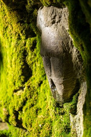 This close-up image showcases a weathered stone face covered in moss, evoking a sense of tranquility and connection to nature's beauty.