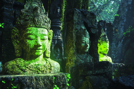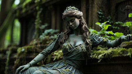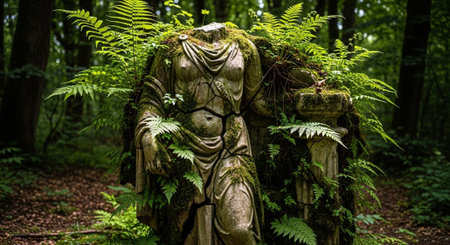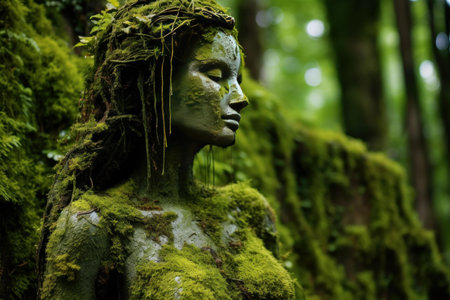Enigmatic and mystical moss-covered forest statue surrounded by lush greenery and serene woodland, inspired by nature and ancient cultural artistry