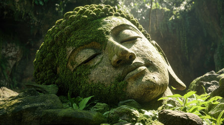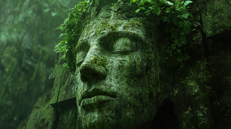 This captivating image features an ancient stone face enveloped in lush greenery, evoking a sense of tranquility and mystery in a serene forest setting.