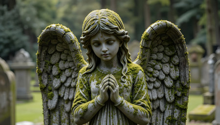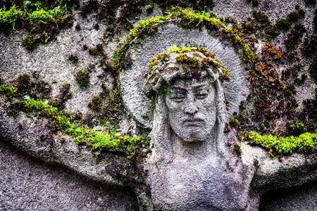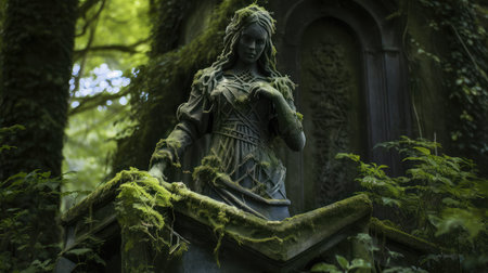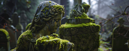 Halloween background with ancient, moss-covered statues in a forgotten graveyard.