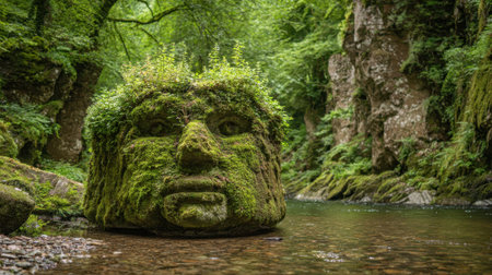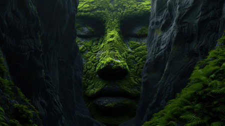 This captivating image showcases a weathered stone face adorned with vibrant moss and lichen, illustrating nature