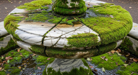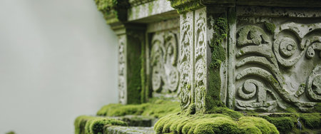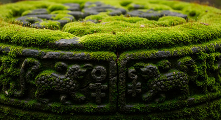 AI Generated. Moss covered stone structure with carved designs on the surface