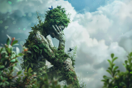Man with Plants Sprouting from Head in Grassy Field Concept for Growth and Nature Connection