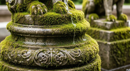 A close-up of a weathered, ancient stone artifact covered in a thick, vibrant layer of green moss. The detailed carvings underneath depict lions or other mythical creatures, showing nature reclaiming a piece of history and highlighting the texture of time.