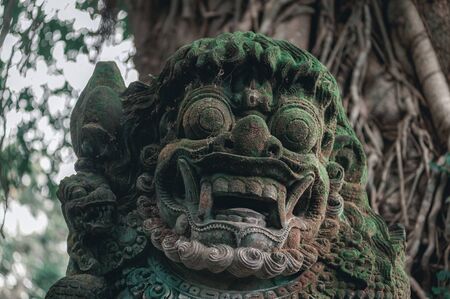 Sculptures of gods and demons carved from stone. Decor and decoration of ancient Hindu temples. Monkey Forest, a sacred temple complex in Ubud on the island of Bali, Indonesia.