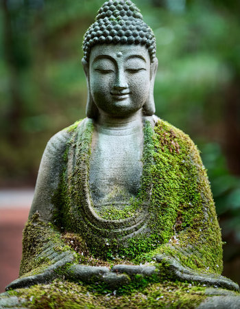 Ancient Buddha statue partially covered with moss, showcasing a sense of history and timelessness in a jungle setting.