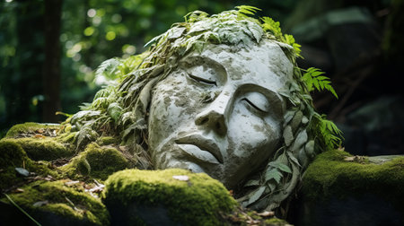 a statue buried under rocks in the forest, showcasing elegant and emotive faces, with highly detailed foliage surrounding it. this avant-garde portraiture captures a close-up view of the white and green statue, creating a captivating image reminiscent of national geographic photography. the intricate foliage adds depth and beauty to the overall composition. ai generated
