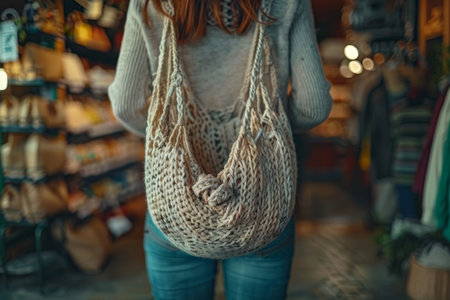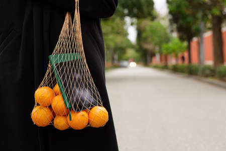 Woman carrying reusable mesh bag after shopping food in city. Sustainable lifestyle with zero waste and plastic free shopping concept
