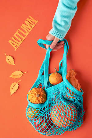 Female hand in blue mint sweater holding pumpkins in turquoise string bag on orange paper background. Autumn seasonal concept for Fall shopping or season sales.