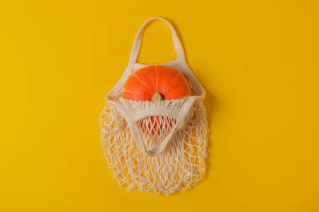 Flat lay orange pumpkin in reusable mesh string bag on yellow background. The concept of Halloween, Thanksgiving. Zero waste