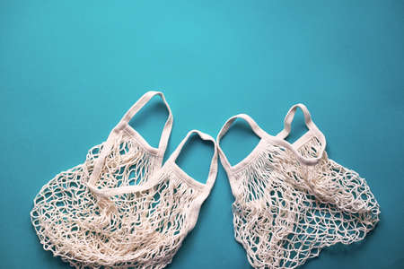 Replacing plastic bags. Taking care of the environment. Empty mesh, awosika on a blue background.
