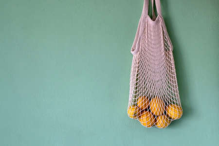 Mesh bag with fruits in female hand. hold mesh shopping bag on light background. Modern reusable shopping, zero waste concept