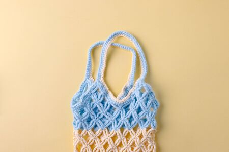 A traditional knitted shopping bag on a blue concrete floor. Eco friendly zero waste bag. Close-up. Needlework. Ecological stuff for home. Copy space.