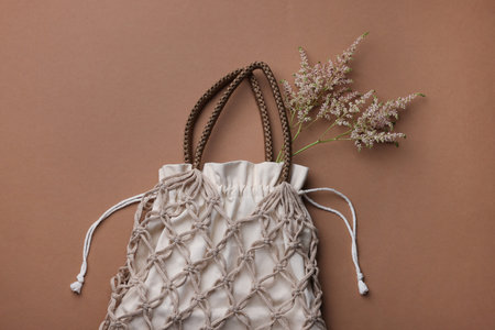 Handmade macrame shopping bag with spikes on brown background, top view
