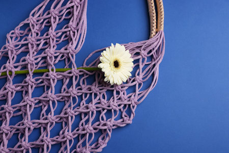 Macrame shopping bag with flower on blue background, top view. Space for text