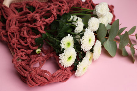 Macrame shopping bag with flowers on pink background, closeup