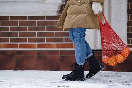 Happy woman carry reusable bag with oranges from the shop. Walking outdoors in winter. Festive atmosphere. Ecofriendly fruits shopping Zero waste concept Close-up Copy space
