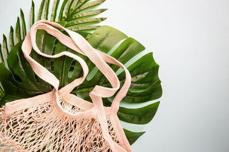 Eco friendly mesh bag on a grey background. String bag made of cotton threads. Zero waste lifestyle. eco shopper, reusable sustainalbe shopping.