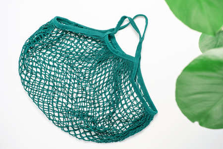Reusable cotton shopping string bag on green and beige background. Zero waste concept. No plastic