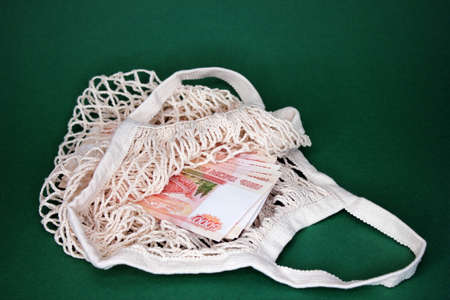 A bundle of Russian banknotes in an eco-friendly knitted bag