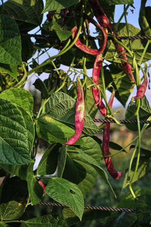 Runner beans Phaseolus coccineus plant with ripe purple colored pods and green foliage