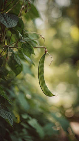 A detailed photograph of a single Green bean, swaying gently in the wind, captured in natural daylight. Fresh and airy atmosphere, soft motion blur on leaves, crisp details on textures, background softly blurred into natural greenery, cinematic natural light, realistic photography.