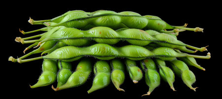 Fresh, Organic Green Soybeans, Edamame Pods Isolated on Black, Healthy Plant Based Food Ingredients