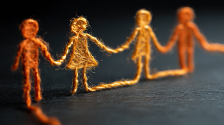 A representation of connection among diverse individuals illustrated with string figures holding hands, symbolizing unity and community bonds.