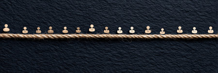 A row of blue figures stands on a blue rope, with two red figures standing out in the middle.