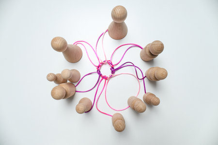 Team of wooden figures connected by lines symbolizing social networking and teamwork. Concept Networking, Teamwork, Wooden Figures, Connections, Collaboration