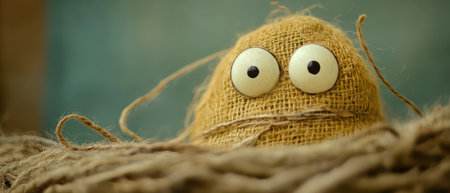 A whimsical character made of burlap with large eyes peeks out from a tangle of rope in a soft light setting.