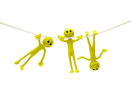 Smiling happy face icons drawn on many wooden blocks connected with each other with hand drawn lines. Over yellow background.
