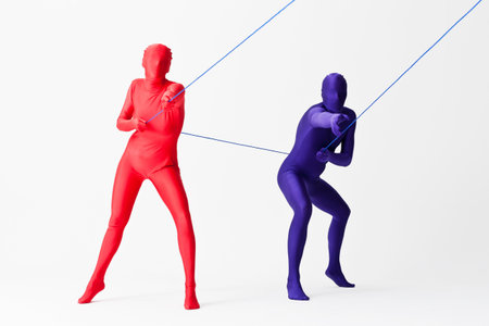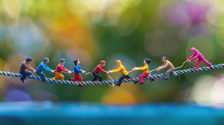 Miniature figures tugofwar, golden hour backlight, macro perspective, unity theme
