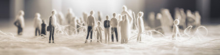 Group of miniature unrecognizable wool backlight people with threads over defocused city and space for text. AI generative illustration.