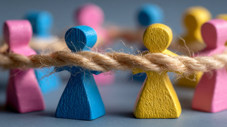 Colorful wooden figures in blue, yellow, and pink are intertwined with a natural rope, forming a harmonious circle that represents collaboration, solidarity, and collecti