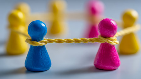 A network of string links various human icons, symbolizing connectivity, collaboration, and the importance of community in an abstract setting.