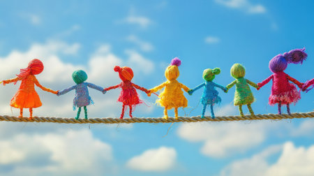 A vibrant scene featuring colorful handmade yarn dolls holding hands on a rope. This joyful image symbolizes friendship and unity against a backdrop of beautiful patterns and flowers, perfect for celebrating creativity.