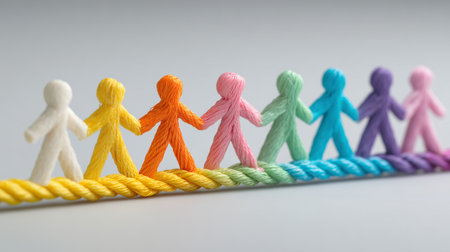 Yarn figures holding hands on a colorful rope symbolizing community connection and teamwork