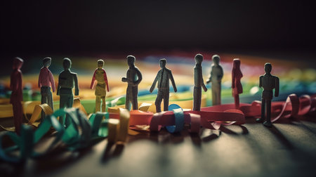 Artistic top-down macro shot of rainbow-colored pawns forming a circular connection. This image symbolizes unity and diversity, captured with bright, clean lighting.
