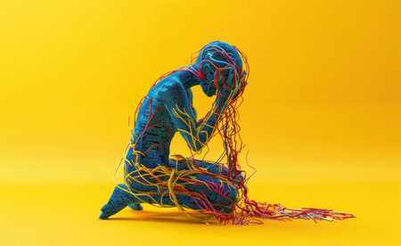 Sculpture of sitting woman surrounded by wires on yellow background symbolizing modern art and technology integration