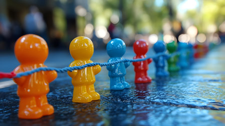 A colorful plastic figures are lined up on wet surface, connected by blue string, creating playful and vibrant scene. background is blurred, highlighting figures