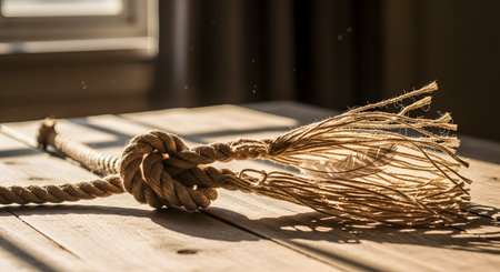 A thick, rustic rope with a tight knot lies on a weathered wooden surface, illuminated by a warm sunbeam that highlights floating dust particles. The end of the rope is frayed, adding to the textured and atmospheric quality of the scene. The image can symbolize concepts like connection, strength, problems, or being tied down.