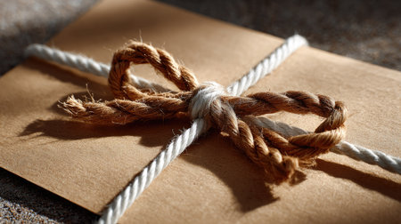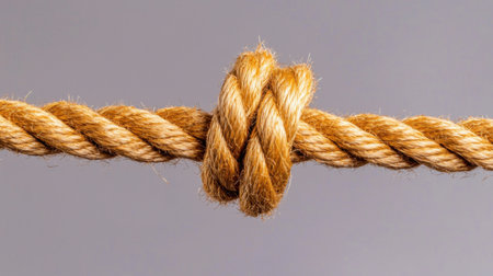 Close-up of a tight rope knot, showcasing the intricate texture and craftsmanship of natural fiber. Ideal for representing strength, stability, and craftsmanship.