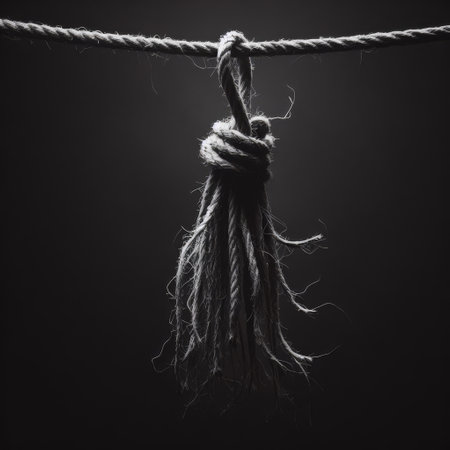 A stark image of a frayed rope against a dark background, symbolizing tension and resilience. The threads barely hold together, evoking the concept of a breaking point. AI generation