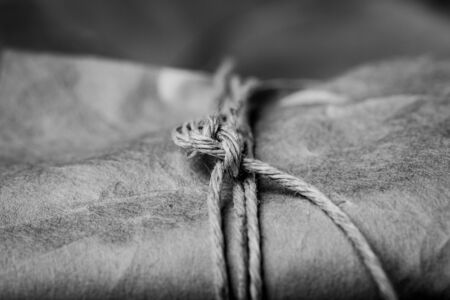 Close up of string looped over a brown paper package leading to a child's block with a question mark on a textured gray background.