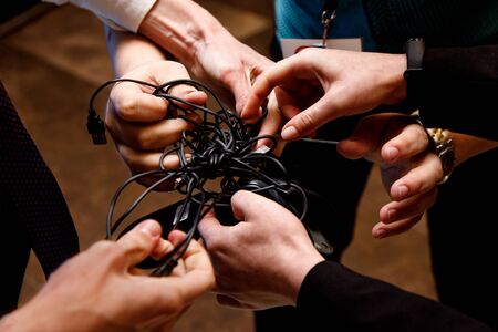 Generative AI, peoples hands working together to untangle a knotted rope. business teamwork.