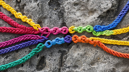A stunning display of colorful woven ropes intricately intertwined on a textured stone surface, creating a vibrant and artistic visual perfect for design projects.