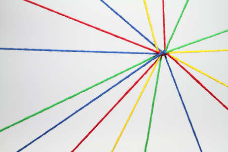 Abstract colored threads are stretched on pins on white background depicting ties and knots. Logistic grid, geometric, connections, isometrics and spirograph