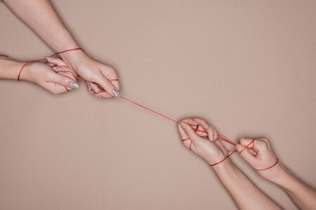 Two hands grasp a red thread, symbolizing connection and shared experiences across cultures.