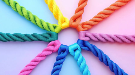 Diverse team strength in unity, strong network of ropes with integrated colors on background.